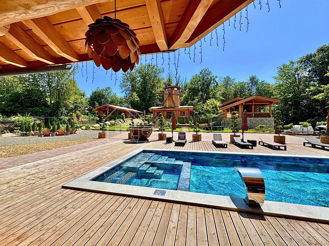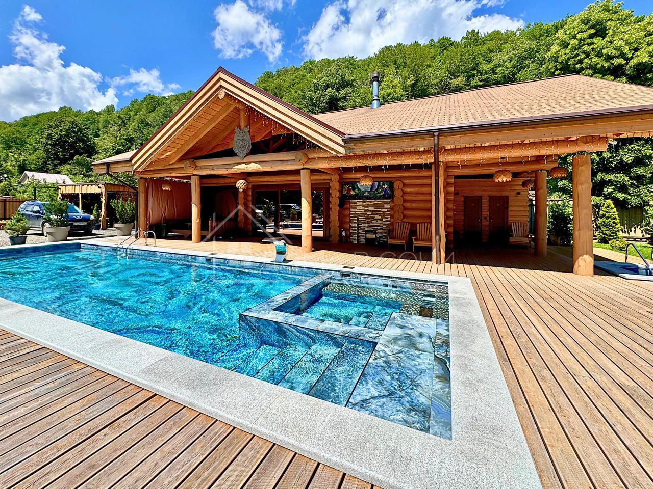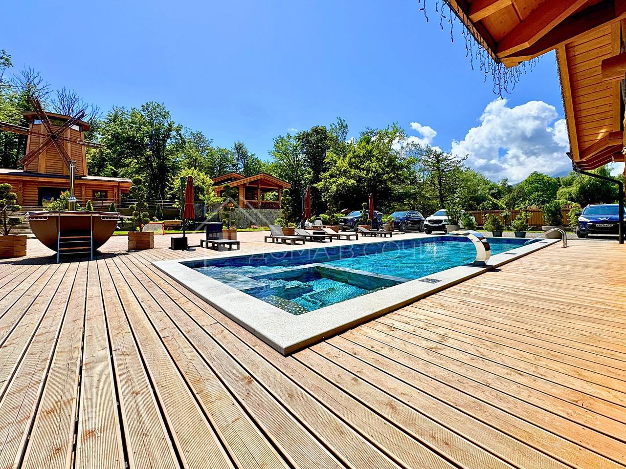 Хозяйский дом 220 м2. Гостевой дом 1 этаж 115 м2. Гостевой дом «Мельница» два этажа 70 м2. Банный комплекс 2 этажа с зоной отдыха 50+ м2, большой бассейн 12/4 в максимальной комплектации с джакузи, детской зоной противотоком, подсветкой и водопадом. Летняя беседка с зоной отдыха 70 м2. Зимняя беседка 60 м2 оборудованная кухней и зоной отдыха для большой компании (игровая приставка, проектор, зона ТВ и тд). На весь комплекс выделено 45 кВт света. Заведен центральный газ (полное автономное отопление). Вода - скважина 90 м со станцией фильтрации. Интернет Мегафон. Дополнительно установлен генератор на 36 кВт с автоматическим подключением.